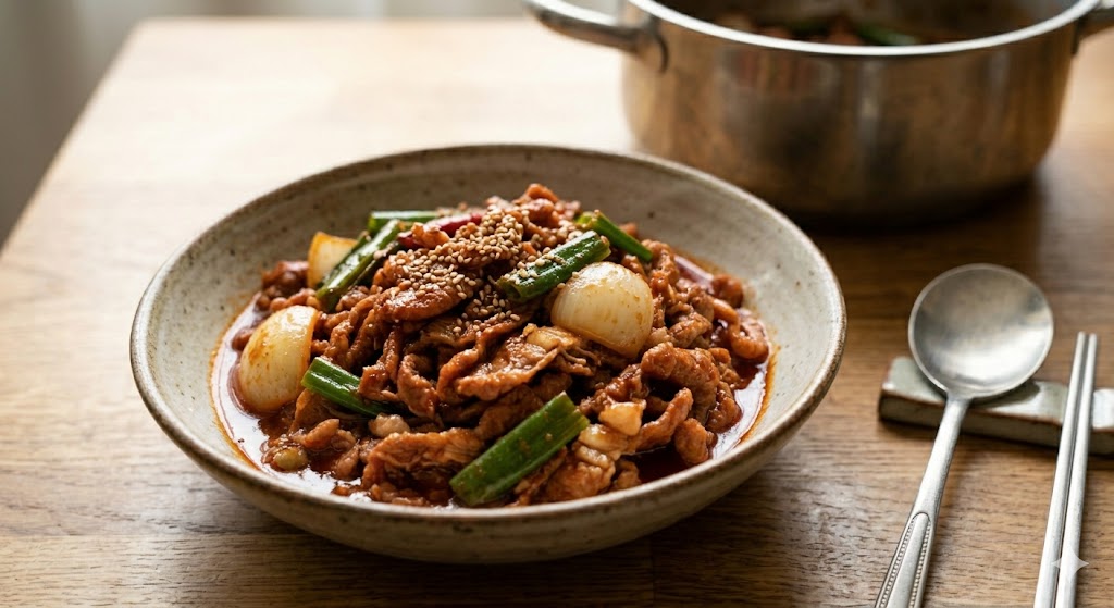 - 센 불 볶음 (핵심): 양념을 고기에 골고루 입힌 뒤 불을 가장 센 불로 올립니다. 양념의 수분이 순식간에 날아가면서 불맛이 나고 텁텁함 없는 화끈한 감칠맛이 폭발합니다.