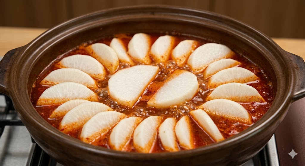 - 무 조리기: 무는 1.5cm~2cm 두께로 도톰하게 반달썰기 합니다. 넓은 냄비 바닥에 손질한 무를 겹치지 않게 깝니다. **[이미지 1]**처럼 무 위에 만들어둔 양념장의 절반을 골고루 얹습니다.