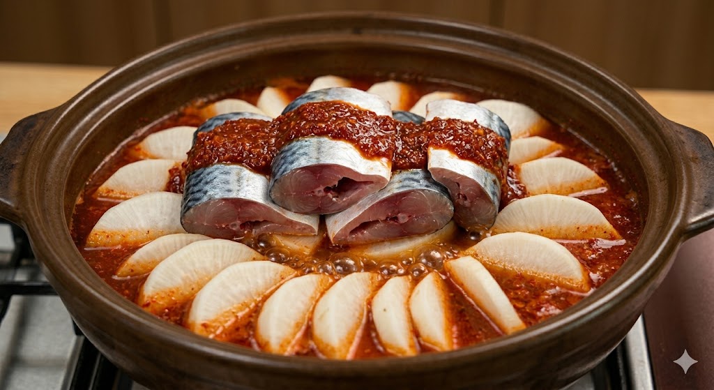 - 불 조절: 무 익힐 땐 중불, 고등어 넣고는 센 불(5분) -> 중약불(15분)로 서서히 조려야 양념이 겉돌지 않습니다.
