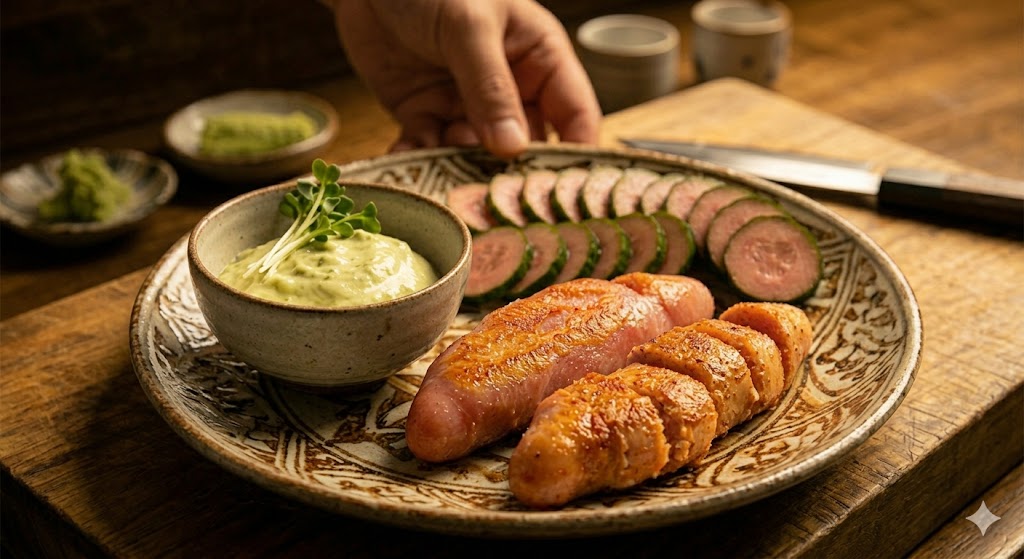 - 신선한 재료: 테이블 위에 토실토실한 저염 명란젓, 짙은 초록빛의 싱싱한 오이, 고소한 마요네즈, 톡 쏘는 생고추냉이, 버터 조각, 레몬 조각이 정갈하게 놓여 있습니다.
