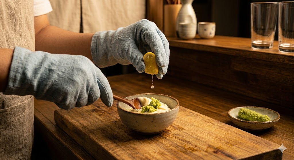 - 마요 소스 만들기: 작은 볼에 마요네즈, 생고추냉이, 레몬즙을 넣고 사용자가 숟가락으로 부드럽게 섞고 있는 과정입니다.