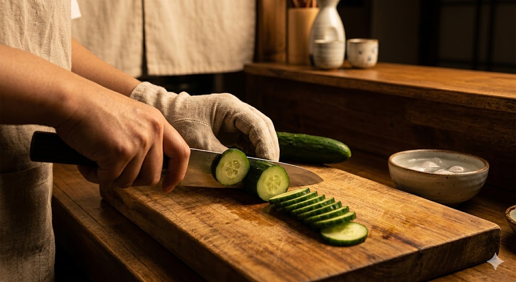 - 오이 손질: 도마 위에 깨끗하게 씻은 오이가 놓여 있고, 사용자가 일정한 두께로 오이를 동그랗게 썰고 있는 모습입니다.