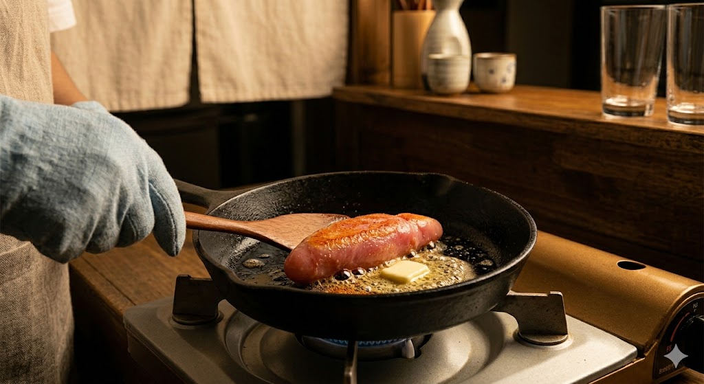 - 명란 굽기: 달궈진 프라이팬 위에서 버터에 녹아 노릇노릇하게 구워지는 토실토실한 명란젓의 모습입니다.