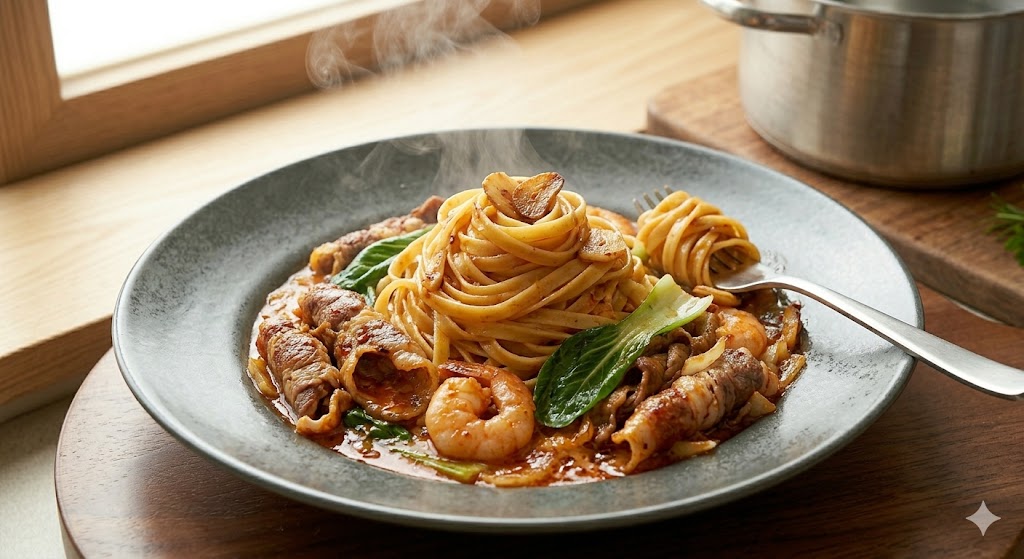 따뜻하게 데운 접시에 면을 먼저 돌돌 말아 올리고, 그 주변으로 차돌박이, 새우, 청경채를 풍성하게 배치합니다. 남은 소스를 면 위에 듬뿍 끼얹어준 뒤, 기호에 따라 크러쉬드 레드페퍼나 후추를 살짝 더 뿌려주면 시각적인 완성도가 높아집니다. 크림의 부드러움 뒤에 오는 마라의 알싸한 끝맛이 일품인 이 요리는 와인이나 맥주와도 환상적인 궁합을 자랑합니다.