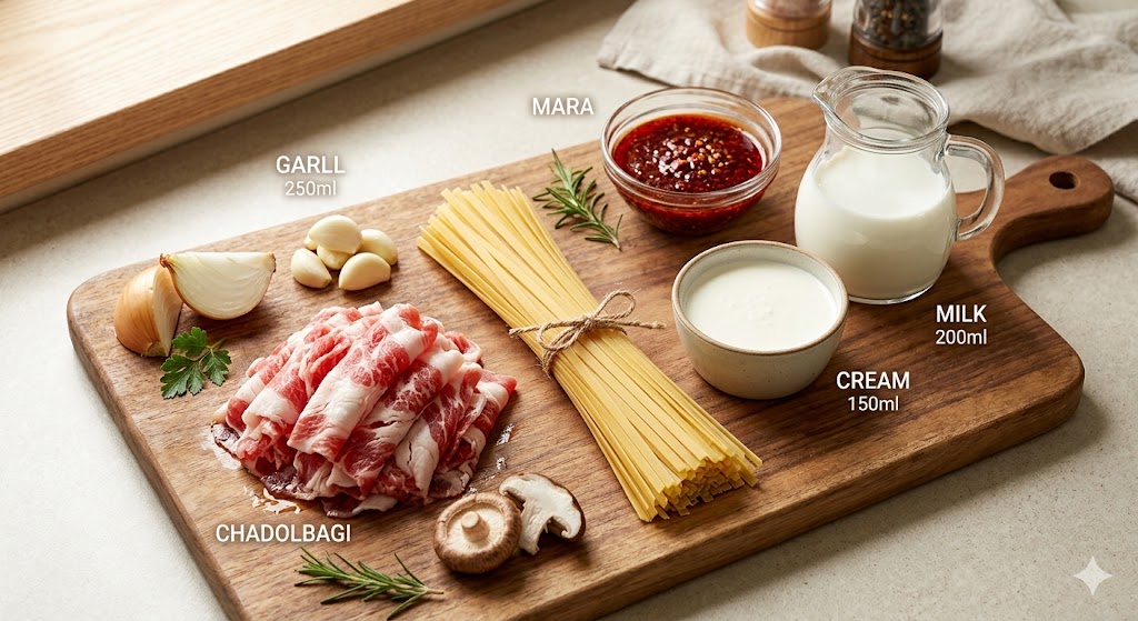 - 메인 재료: 파스타면(페투치네 또는 스파게티) 1인분, 우유 200ml, 생크림 150ml, 마라 소스 1.5~2큰술(취향껏 조절).