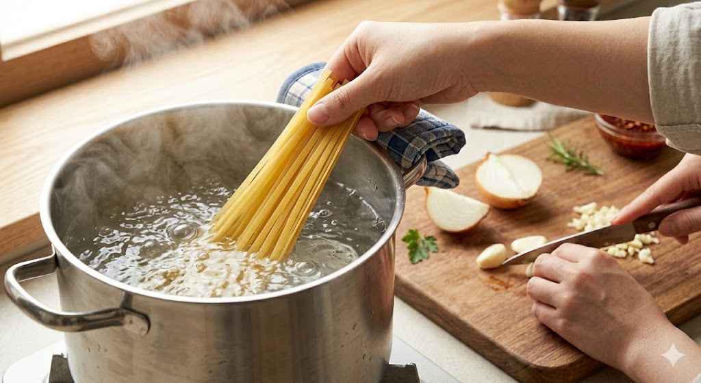 파스타의 기본은 면의 식감입니다. 크림 소스에서 한 번 더 볶아낼 것을 계산하여 평소보다 살짝 덜 익히는 것이 포인트입니다.