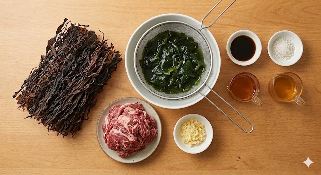 - 메인 재료: 소고기(국거리용 양지 또는 사태) 200g, 마른미역 20g(불리면 약 4인분), 물 1.5L