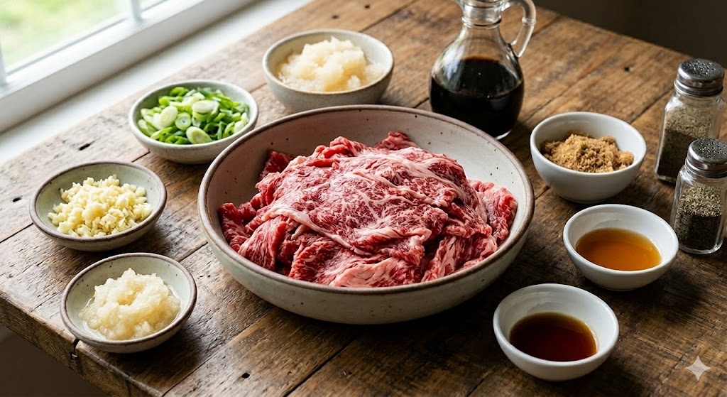 가장 중요한 것은 신선한 고기입니다. 소고기는 얇게 썬 불고기용(설도, 앞다리살 등)으로 600g을 준비해 주세요. 비계가 적당히 섞인 부위가 부드럽고 고소합니다.