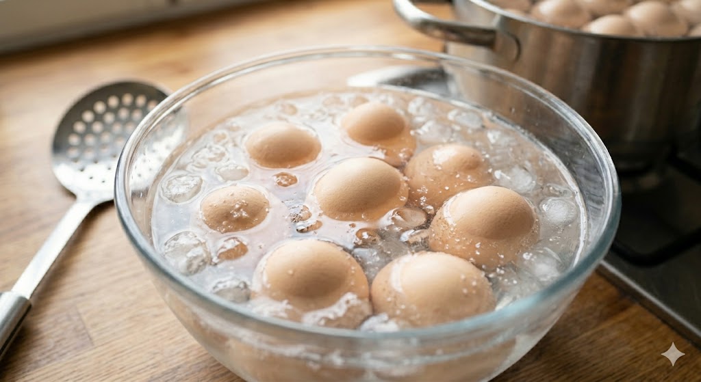 - 얼음물 투하: 타이머가 울리면 곧바로 삶은 계란을 건져 얼음물이나 아주 찬물에 담급니다.