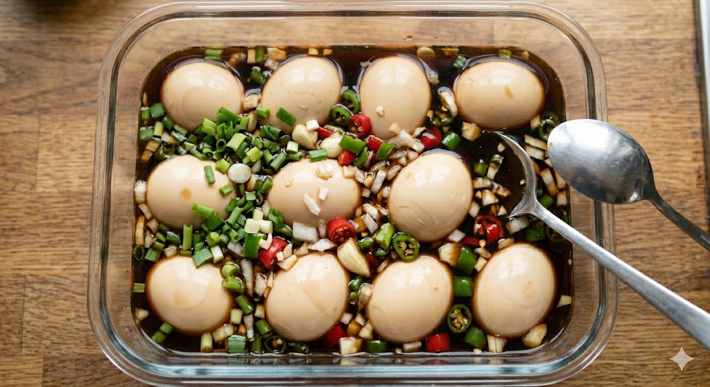 - "왜 끓이지 않나요?" 간장을 끓이면 채소의 비타민이 파괴되고 아삭한 식감이 사라집니다. 마약 계란장은 '저온 숙성' 요리이므로, 신선한 채소의 향이 간장에 은은하게 배어들도록 끓이지 않는 것이 정석입니다. 또한, 설탕이 잘 녹도록 충분히 저어주는 것이 핵심입니다!