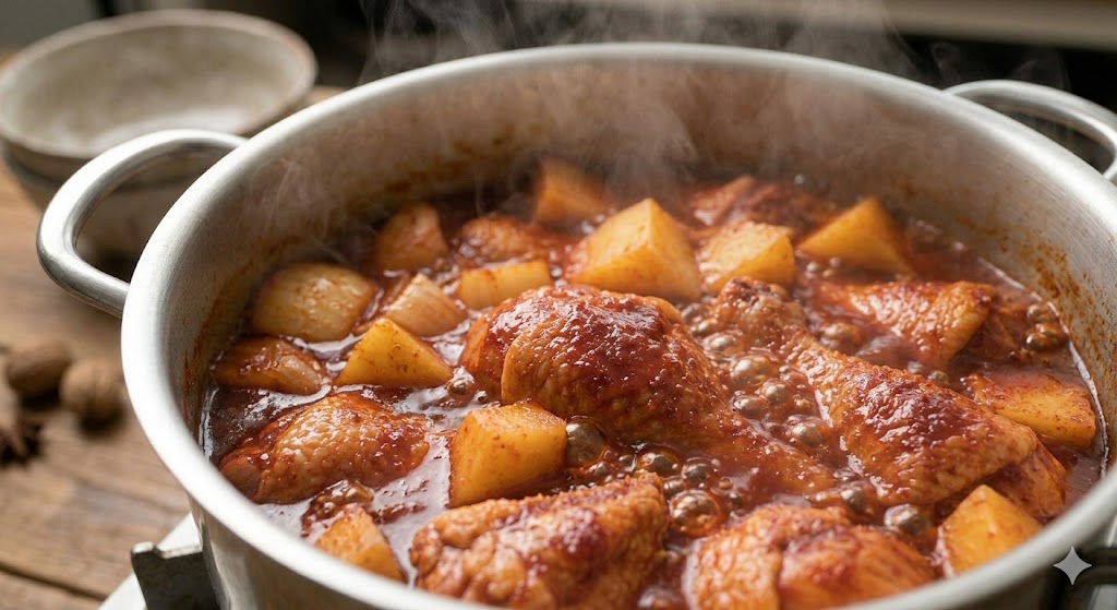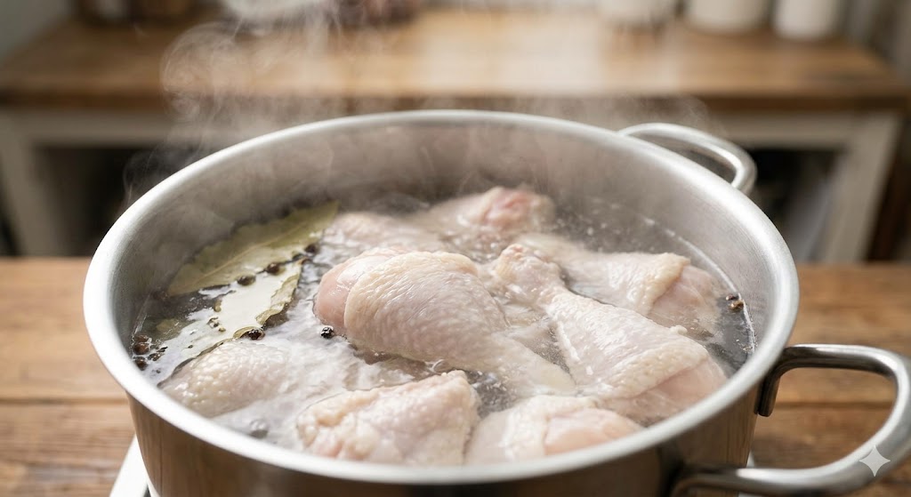 설탕의 중요성: 데친 닭을 냄비에 담고 물을 부은 뒤, 설탕을 먼저 넣어 끓입니다. 이는 설탕의 입자가 고기 속까지 침투하여 육질을 부드럽게 만들고 단맛이 깊게 배게 하는 중요한 단계입니다.