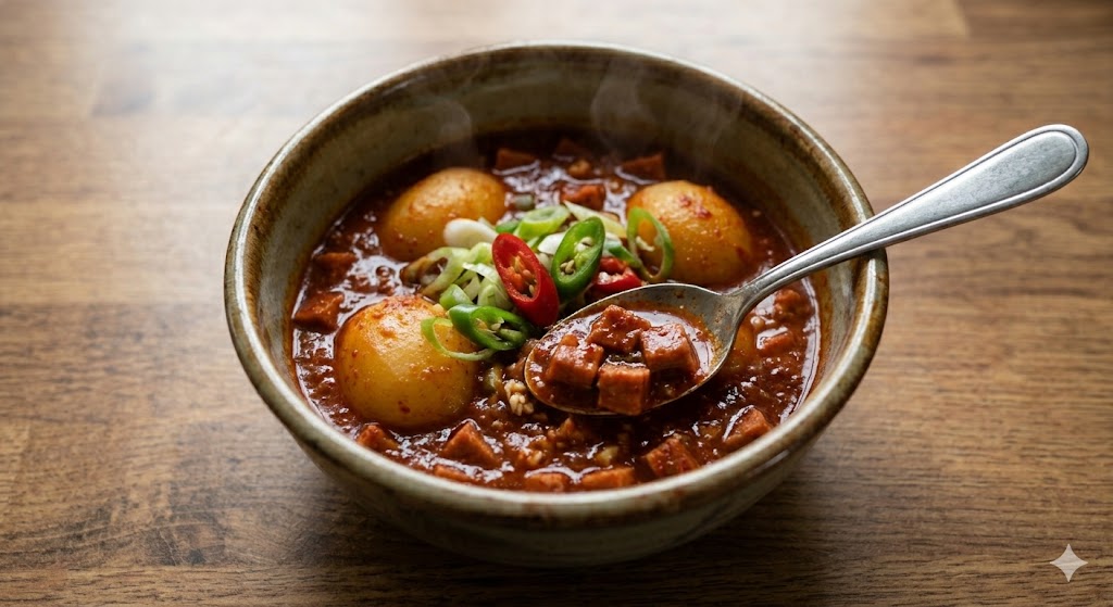 핵심: 국물이 졸아들면서 감자의 전분이 나오고, 으깬 스팸의 풍미가 극대화됩니다.
