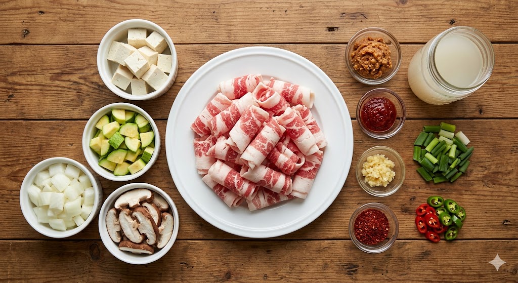가장 먼저 할 일은 신선한 재료를 준비하는 것입니다. 고깃집 된장찌개의 핵심은 '아끼지 않는 재료'와 '비법 양념 비율'에 있습니다.