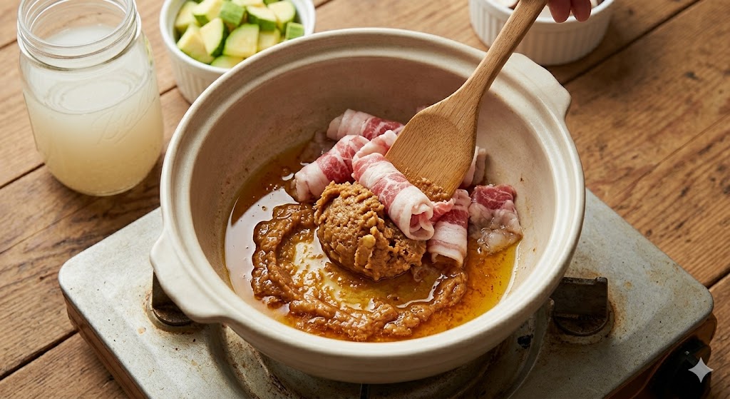 고기가 익으면 된장 2큰술, 고추장 0.5큰술, 쌈장 0.5큰술을 넣고 고기 기름에 함께 볶아줍니다. 된장을 살짝 볶아주면 특유의 콩 비린내가 사라지고 구수한 풍미가 훨씬 진해집니다. 이때 불이 너무 세면 탈 수 있으니 중약불을 유지하세요. 이것이 바로 고깃집 된장찌개의 첫 번째 비밀입니다.