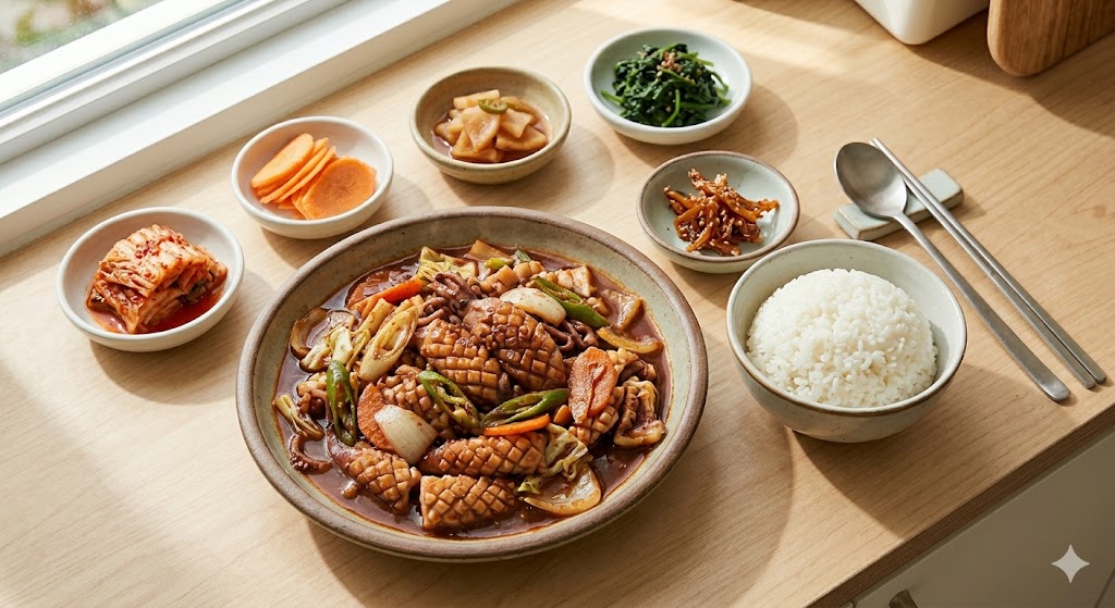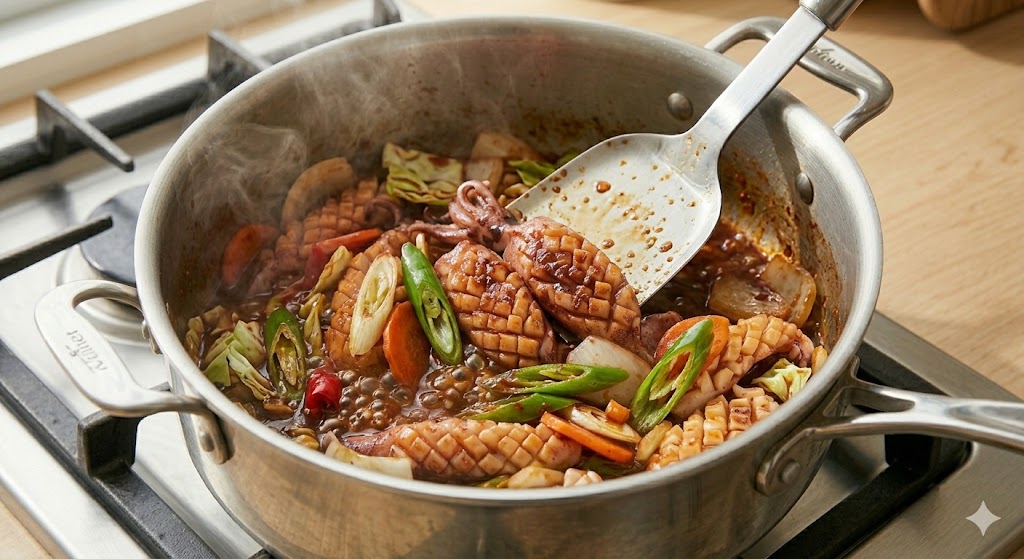 - 센 불 유지는 필수: 불이 약하면 채소와 오징어에서 물이 나와 '오징어 찌개'처럼 될 수 있습니다. 무조건 센 불에서 빠르게 볶으세요.