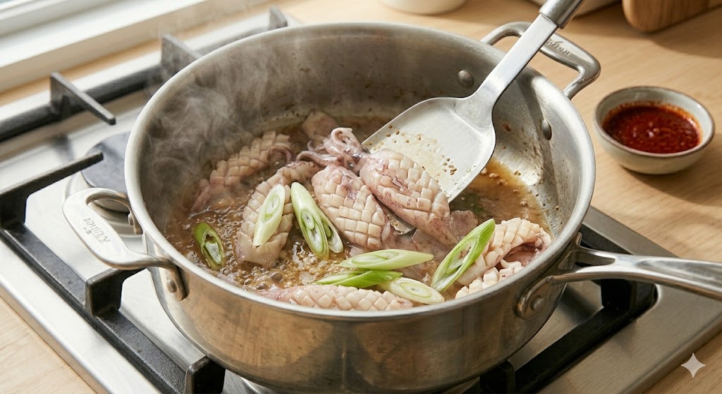 Tip: 오징어를 먼저 볶아 수분을 날려주어야 나중에 물이 생기지 않고 탱탱한 식감을 유지할 수 있습니다.
